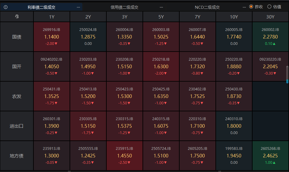 截至今日17:30,利率市场收益率多数下行,10Y国债上行0.1bp至1.78%,30Y国债上行0.2bp至2.28%。信用市场收益率多数下行,2Y期AAA信用债下行2bp至1.59%。债市早盘上涨。中国央行开展5亿元7天期逆回购操作,零投放零回笼0亿元。资金面中性,资金情绪指数47,资金价格较昨日下跌,DR001在1.20%附近,DR007在1.33%附近。 当天银行为买方主力,保险呈卖出趋势,银行跟随行情变动多空分歧较大。